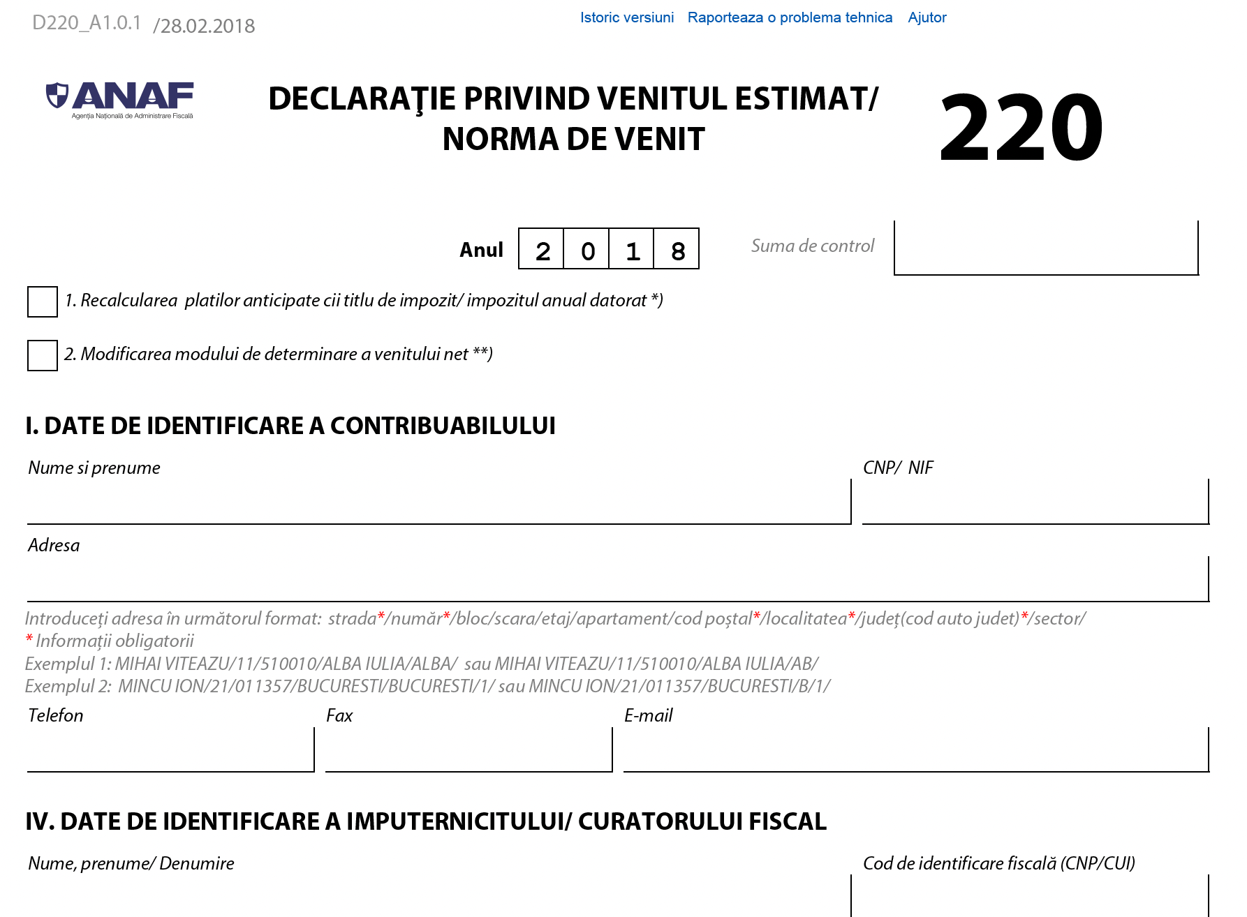 Declaratia 220 este Declaratia privind venitul estimat/norma de venit cf. OPANAF nr.3780/ 22.12.2017 (incepand cu anul de raportare 2018).