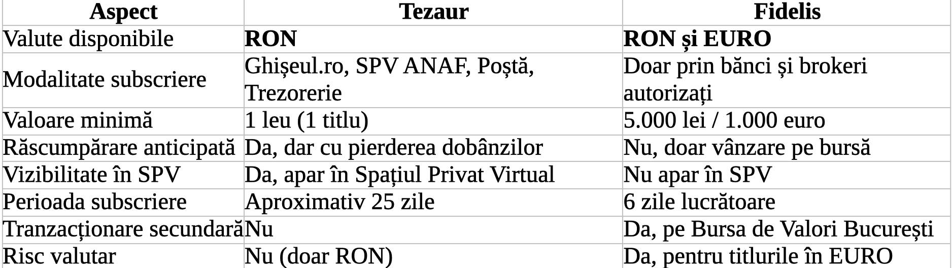 Compararea lor ajuta investitorii sa aleaga solutia potrivita in functie de nevoile si orizontul de timp. In continuare, vom analiza principalele diferente dintre titlurile Fidelis si Tezaur.